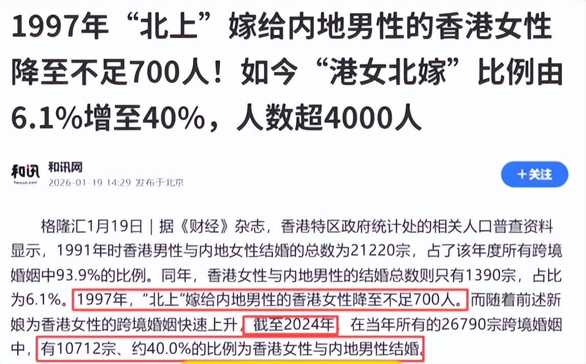 而且令人始料未及的是,近期的一個資料更讓人跌破眼鏡,港媒報道,香港女性北嫁內地男性的比例已從6.1%激增至40%女性。根據香港特區政府資料,1997年北上與內地男性結婚的香港女性尚不足700人;而至2024年,此類婚姻登記已達10,712宗。